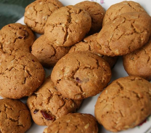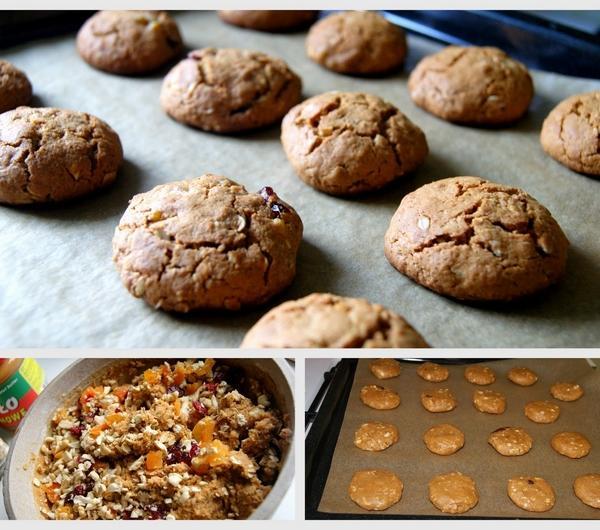 bakalie i znów wymieszałam.Toczyłam kulki (bardzo dobrze się lepiły, nawet nie potrzeba było rękawiczek), kładłam na blasze wyłożonej papierem do pieczenia i lekko spłaszczałam. Zrobiłam spore odstępy, ale po upieczeniu okazało się, że moje