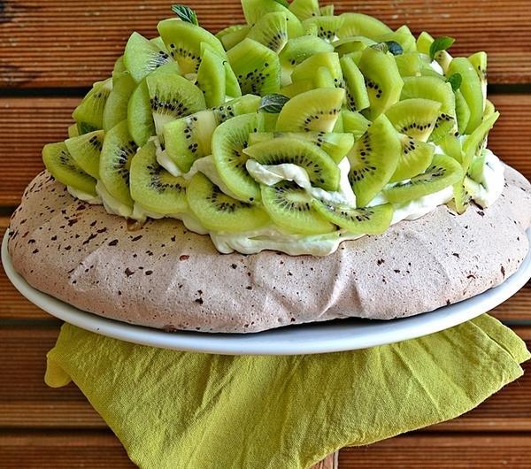 Owoce obrać ze skórki, pokroić na plastry i wcisnąć w masę kremową, posypać wierzch świeżą