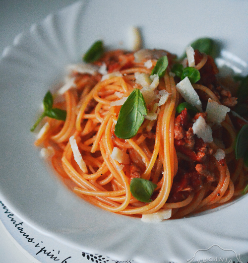 mojego pomysłuSkładniki: na 4 porcje250g makaronu pappardelle1 puszka krojonych pomidorów1 duża czerwona papryka3 łyżki suszonej czerwonej słodkiej papryki1 cebula3 ząbki czosnku1 łyżka śmietany kremówki 30%sól, pieprzbazylia, oregano (opcjonalnie)2 łyżki parmezanuPrzygotowanie:Ugotować makaron Al'dente- odstawić.Pokroić w paski paprykę oraz cebulę.Czosnek przecisnąć przez praskę.Rozgrzać na patelni olej,zeszklić cebulę oraz czosnek, następnie dodać suszoną paprykę oraz poszatkowaną i chwilę poddusić by zmiękła ale nadal była jędrna.Do całości przełożyć z puszki pomidory i dusić 5 minut.Doprawić solą, pieprzem, dodać zioła i na końcu wmieszaćśmietanę.Ugotowany makaron przełożyć do sosu, wymieszać i podawać posypując wierzch parmezanem.Smacznego!