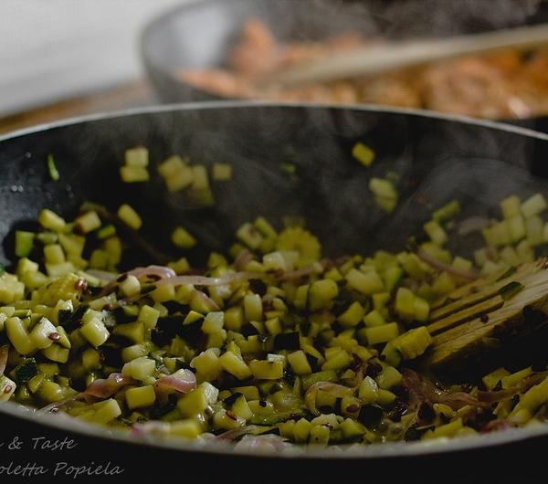Na rozgrzanej oliwie podsmażyć czosnek, dodać cebulę. Po 5 minutach domieszać cukinie, kukurydzę i dusić pod przykryciem przez 10 minut. W połowie duszenia domieszać wodę wymieszaną z sokiem z cytryny i limonki oraz siemię lniane, odkryć. Na koniec dodać koperek, natkę pietruszki i przyprawić solą i pieprzem.Warstwa mięsna