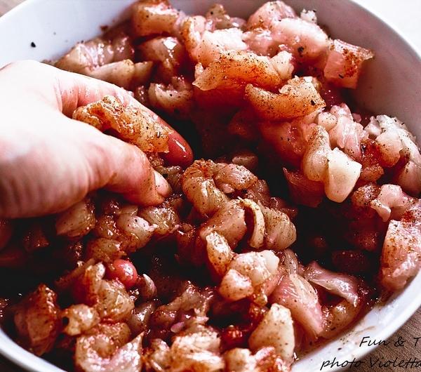 Pokrojone mięso wrzucić do miseczki, zalać oliwą i przyprawić solą, pieprzem oraz papryką, wymieszać. Następnie wrzucić na rozgrzaną patelnię, podsmażyć. Startą marchew, pietruszkę, skórkę z limonki wymieszać z sokiem z cytryny, dodać do mięsa. Smażyć ok 1-2 minut.