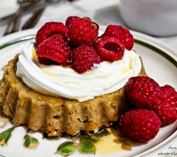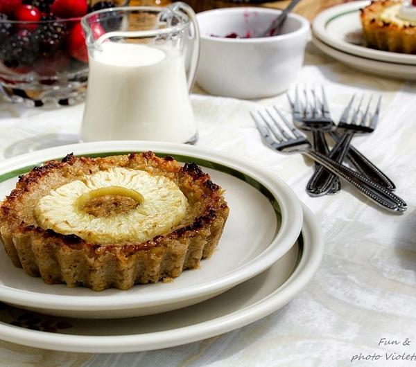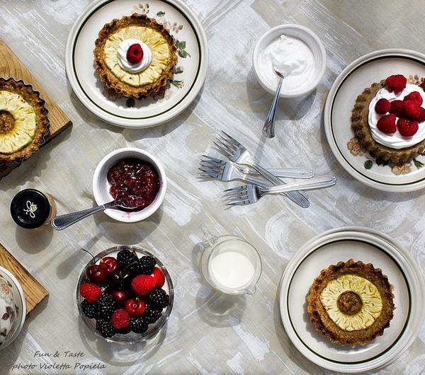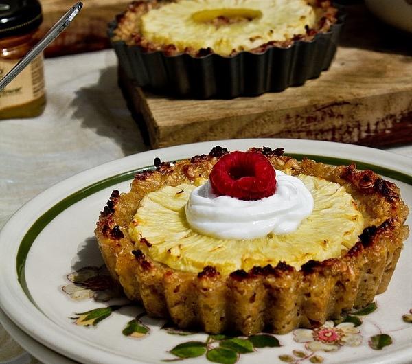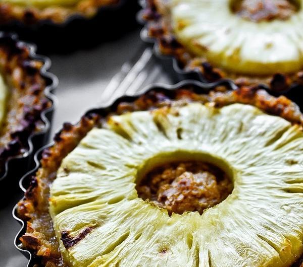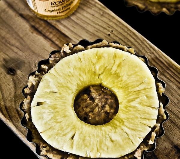Na 4 tartaletki100 g płatków owsianych200 ml mleka orzechowego1 jabłko ok 130 g - zetrzeć na tarce o małych oczkach50 g miodu20 g złotego siemienia lnianego4 plastry świeżego ananasaolej arachidowy do wysmarowanie foremekMleko zagotować, domieszać pozostałe składniki (prócz ananasa), zmniejszyć temperaturę i podgrzewać przez 5 minut. Następnie przełożyć masę do wysmarowanych foremek, ułożyć po plasterku ananasa. Odstawić do ostygnięcia, następnie przykryć i schować na noc do lodówki.