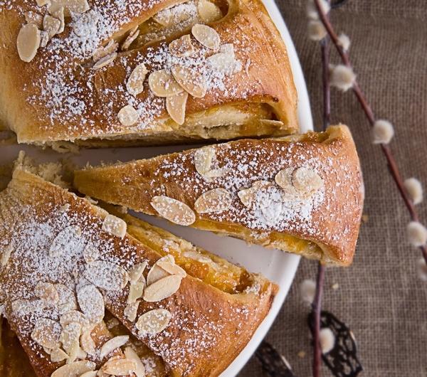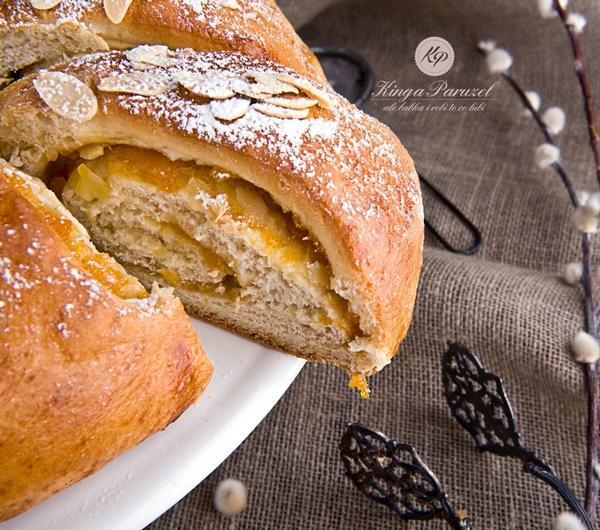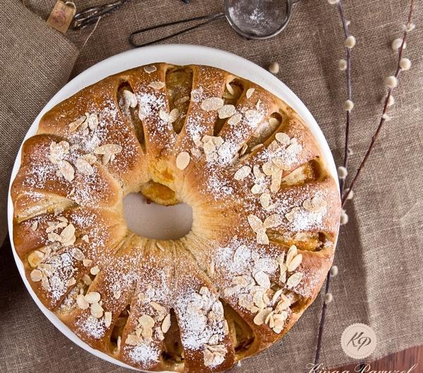 Składniki na ciasto:20 g świeżych drożdży lub paczka 7 g suszonych1 szklanka ciepłej wody6 łyżek cukru4 szklanki ciepłej mąki typ 500 (miskę z mąką ustawić na kaloryferze) -można pominąć też wyjdzie.3 jajka1 łyżeczka solimigdały w płatkach do dekoracjicukier puder do dekoracjiPrzygotowanie:1. Przygotować rozczyn mieszając ze sobą drożdże, letnią wodę, 1 łyżkę cukru i 1/2 szklanki mąki. Odstawić na 10 min.2. Do rozczynu dodać pozostały cukier i 2 jajka. Wszystko mieszamy trzepaczką lub mikserem ok 1 min.3. Dodajemy pozostałą mąkę i sól. Ugniatamy ciasto ok 10 min aż będzie gładkie i elastyczne. Można podsypać mąką jednak nie dodawaj jej zbyt dużo bo ciasto zrobi się twarde.4. Ciasto uformować w kulę, oprószyć mąką, przykryć bawełnianą ściereczką i odstawić w ciepłe, nieprzewiewne miejsce na ok 20 min.5. Po 20 min uderz pięścią w ciasto. Stolnice podsyp mąką i rozwałkuj ciasto na prostokąt o wymiarach ok 25 x 45 cm.6. Na tak przygotowane ciasto wyłóż masę morelową, posyp ją dodatkowo płatkami migdałów.7. Ciasto zwijaj w rulon wzdłuż dłuższego boku. Uformuj pierścień, mocno łącząc brzegi.8. Przełóż wieniec na blaszkę wyłożoną papierem do pieczenia.9. Ostrym nożem ponacinaj ciasto co 2 cm do 1/3 głębokości. Przykryj wilgotnym, bawełnianym ręczniczkiem i odstaw na 45 min w ciepłe i nieprzewiewne miejsce.10. Kiedy ciasto wyrośnie (podwoi swoja objętość ) posmaruj je rozbełtanym jajkiem, posyp płatkami migdałów i wstaw do piekarnika nagrzanego do temperatury 180 C na około 30 min z funkcją grzania góra-dół. Do momentu aż będzie miało ładny złoty kolor. Możesz sprawdzić patyczkiem czy jest suche w środku. Jeżeli nie to zostaw je trochę dłużej w piekarniku a jeżeli tak to wyjmij i wystudź.11. Podawaj posypane cukrem pudrem.