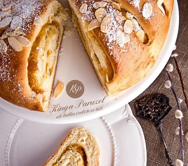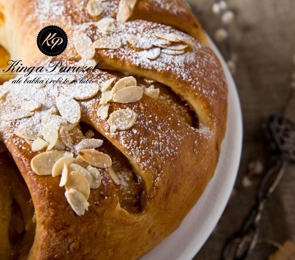 Składniki na ciasto:20 g świeżych drożdży lub paczka 7 g suszonych1 szklanka ciepłej wody6 łyżek cukru4 szklanki ciepłej mąki typ 500 (miskę z mąką ustawić na kaloryferze) -można pominąć też wyjdzie.3 jajka1 łyżeczka solimigdały w płatkach do dekoracjicukier puder do dekoracjiPrzygotowanie:1. Przygotować rozczyn mieszając ze sobą drożdże, letnią wodę, 1 łyżkę cukru i 1/2 szklanki mąki. Odstawić na 10 min.2. Do rozczynu dodać pozostały cukier i 2 jajka. Wszystko mieszamy trzepaczką lub mikserem ok 1 min.3. Dodajemy pozostałą mąkę i sól. Ugniatamy ciasto ok 10 min aż będzie gładkie i elastyczne. Można podsypać mąką jednak nie dodawaj jej zbyt dużo bo ciasto zrobi się twarde.4. Ciasto uformować w kulę, oprószyć mąką, przykryć bawełnianą ściereczką i odstawić w ciepłe, nieprzewiewne miejsce na ok 20 min.5. Po 20 min uderz pięścią w ciasto. Stolnice podsyp mąką i rozwałkuj ciasto na prostokąt o wymiarach ok 25 x 45 cm.6. Na tak przygotowane ciasto wyłóż masę morelową, posyp ją dodatkowo płatkami migdałów.7. Ciasto zwijaj w rulon wzdłuż dłuższego boku. Uformuj pierścień, mocno łącząc brzegi.8. Przełóż wieniec na blaszkę wyłożoną papierem do pieczenia.9. Ostrym nożem ponacinaj ciasto co 2 cm do 1/3 głębokości. Przykryj wilgotnym, bawełnianym ręczniczkiem i odstaw na 45 min w ciepłe i nieprzewiewne miejsce.10. Kiedy ciasto wyrośnie (podwoi swoja objętość ) posmaruj je rozbełtanym jajkiem, posyp płatkami migdałów i wstaw do piekarnika nagrzanego do temperatury 180 C na około 30 min z funkcją grzania góra-dół. Do momentu aż będzie miało ładny złoty kolor. Możesz sprawdzić patyczkiem czy jest suche w środku. Jeżeli nie to zostaw je trochę dłużej w piekarniku a jeżeli tak to wyjmij i wystudź.11. Podawaj posypane cukrem pudrem.