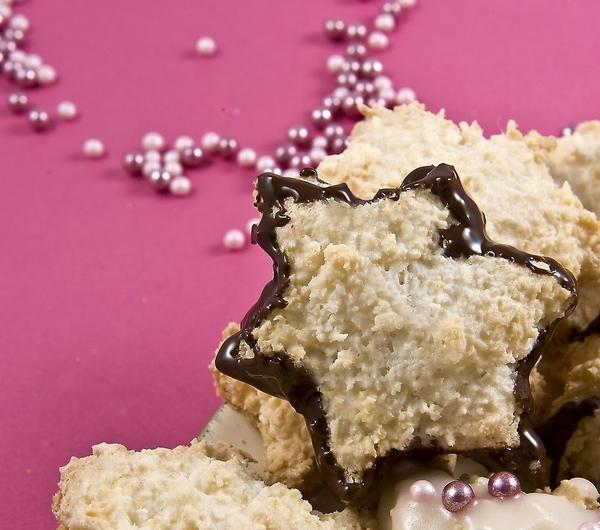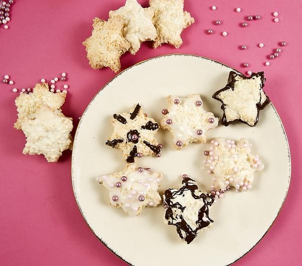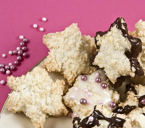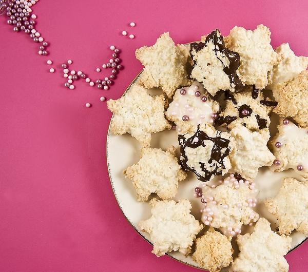 Składniki:2 białkaszczypta soli165g cukru pudru200 g wiórków kokosowych2 łyżki likieru pomarańczowegoskórka z pomarańczy2 wafle tortowedo dekoracji: lukier cytrynowy, polewa czekoladowaPrzygotowanie:1. Białka ubić na sztywną pianę ze szczypta soli. Pod koniec dosypując stopniowo cukier puder.2. Do masy białkowej dodać wiórki kokosowe i 2 łyżki likieru i skórkę z pomarańczy. Całość wymieszać.3. Z wafli tortowych wykrawać foremkami do pierników gwiazdki.4. Na waflowe gwiazdki wykładać masę bezowo - kokosową.5. Całość wstawić do piekarnika nagrzanego do temp 150C , piec ok 30 min aż gwiazdki będę lekko złote.6. Gotowe kokosanki ostudzić i polać lukrem cytrynowym lub czekoladową.