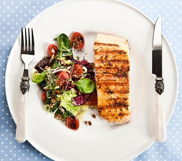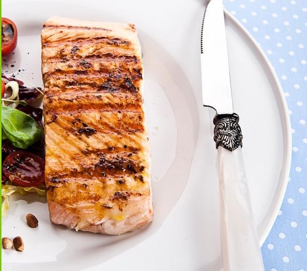 Składniki: (na 1 porcję)200 g świeżego filetu z łososia1 cytrynasól morska (ja używam różowej soli himalajskiej)pieprz biały cytrynowyPrzygotowanie:1. Rybę wyjąc z lodówki odpowiednio wcześniej tak aby miała temperaturę pokojową.2. Skropić obficie sokiem z cytryny i odstawić.3. Patelnie grillową mocno rozgrzać. Wyłożyć na nią łososia skórą do dołu i smażyć ok 3-4 min zależy od grubości (mój kawałek miał niecałe 4 cm) na średnim ogniu.4. Łososia przewrócić na drugą stronę i smażyć połowę czasu tego co przedtem.5. Wyłożyć na talerz i posypać świeżo zmieloną solą i pieprzem.