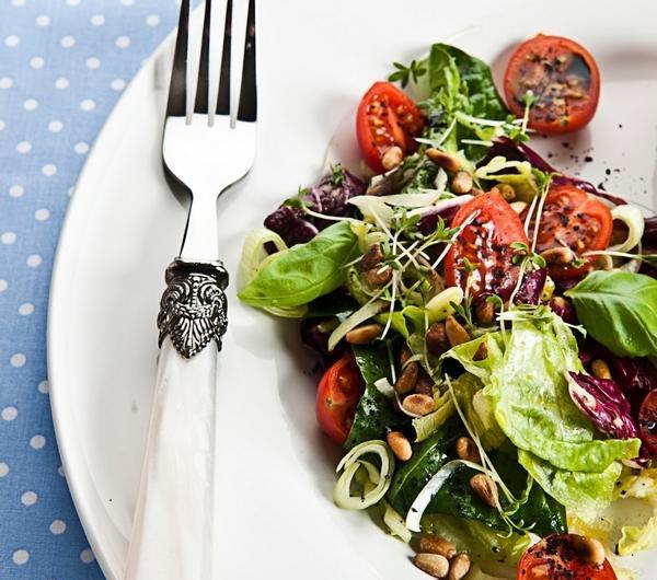 Składniki na sałatę: (dla 1 osoby)2 liście sałaty radicchio2 liście sałaty lodowejkilka liści świeżego szpinakulistki świeżej bazyliikilka sztuk pomidorków koktajlowychkiełki rzeżuchy1 łyzka orzeszków pinowychpokrojony por wg uznania1 łyżka oleju rzepakowegokrem balsamicznysól i pieprz do smakuPrzygotowanie:1. Sałaty, szpinak i bazylię umyć i poszarpać rękami na mniejsze kawałki.2. Pomidorki przekroić na pół, por poszatkować dodać do sałaty. Wszystko doprawić sola i pieprzem, skropić oliwą i kremem balsamicznym. Posypać kiełkami rzeżuchy.3. Orzeszki piniowe podprażyć na patelni i posypać sałatę.