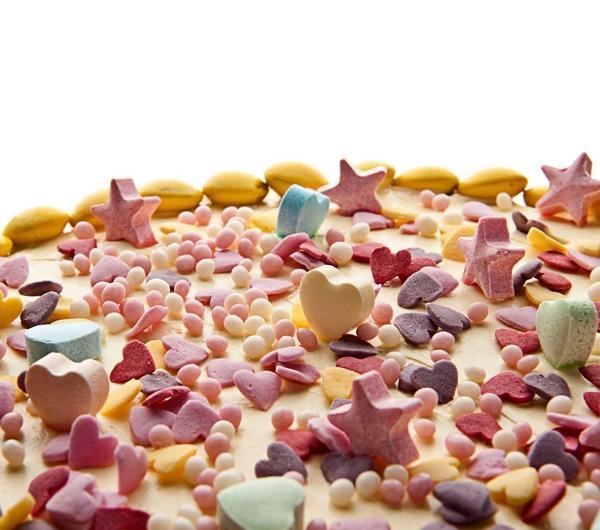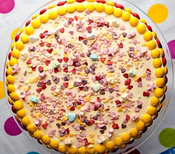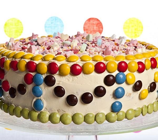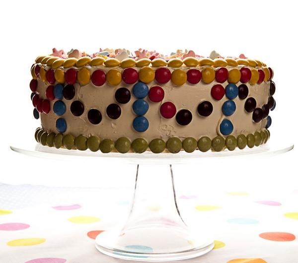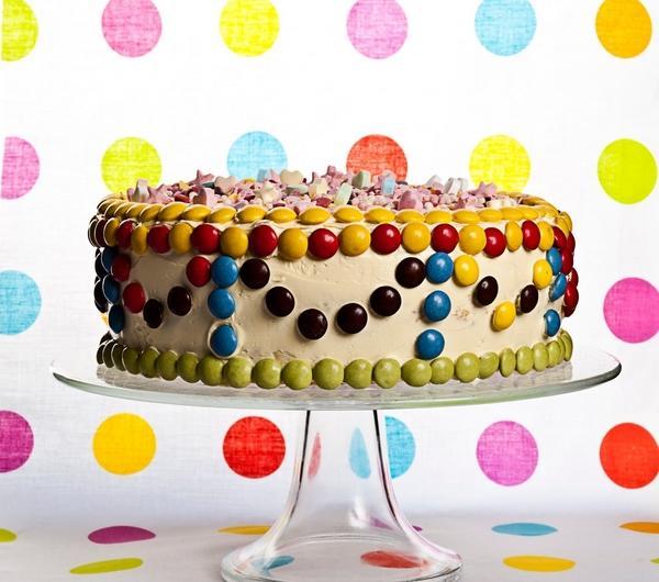 Składniki na krem czekoladowy:300 g miękkiego masła5 łyżek kakao150 g cukru pudruPrzygotowanie:Masło utrzeć na puszysty krem za pomocą miksera, dodać stopniowo cukier i kakao.Składniki na krem waniliowy:300 g miękkiego masła100 g cukru pudrułyżeczka soku z cytrynylaska waniliiPrzygotowanie:Masło utrzeć na puszysty krem za pomocą miksera, dodać stopniowo cukier, miąższ wydrążony z laski wanilii i sok z cytryny.Ponad to:1 słoik konfitury malinowej1 opakowanie bezików2 opakowanie lentilek lun M&Mgarść cukierków pudrowych