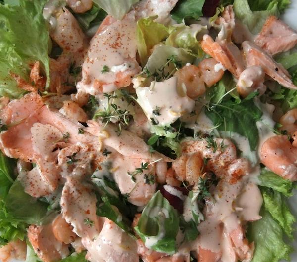 Łososia dzielimy na spore kawałki i rozkładamy na sałacie. Posypujemy