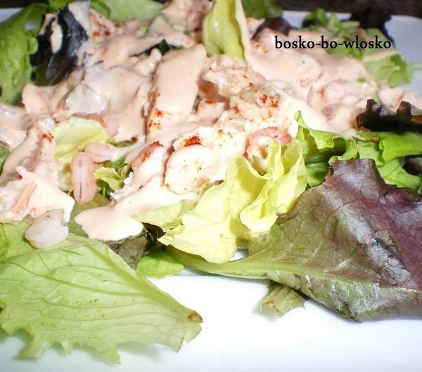 krewetkami, zalewamy sosem i opruszamy odrobiną