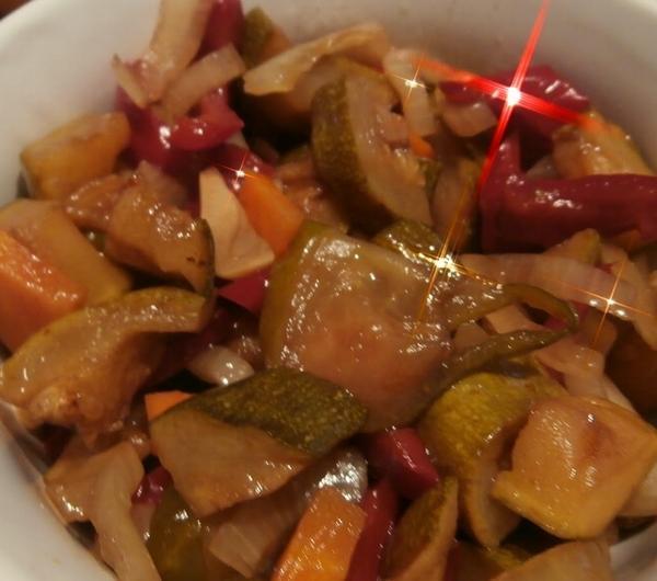 Składniki:cukinia -1 dużacebula -1 dużaczosnek - 4 ząbkipapryka - 1 czerwona, 1 żółtamarchewka 1 dużaogórki gruntowa - ok 5 sztukZalewa:1/2 szklanki oleju1/2 szklanki octujabłkowego1/4 szklanki octu winnego1/2 litra wody2 łyżki soli7-5 łyżek miodu (ja lubię słodszą dodaję siedem)4 liście laurowepieprz w całościziele angielskieWarzywa kroimy. Marchewka w plasterki potem w ćwiartki - tak samo cukinia (ze skórką). Cebulę w półpiórka, czosnek w plasterki, paprykę w paski, ogórki w plasterki (ze skórką również).Zalewę przygotować. Połączyć ze sobą wszystkie składniki i zagotować. Gdy zalewa będzie gorąca w niej rozpuścić miód. Po ugotowaniu ja wyjmuję liść laurowy, pieprz i zielę angielskie. Warzywa dość ściśle ułożyć w słoikach, zalać następnie zalewą ciepłą, ale nie gorącą.Słoiki należy pasteryzować 10 minut. Po czym odstawić do góry nogami na bawełnianej ściereczce na noc.