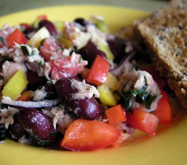 tuńczyk w sosie własnym duże kawałki,1/2 czerwonej cebuli,1 mała puszka czerwonej fasoli,1 spory pomidor,kawałek czerwonej i żółtej papryki,solidna garść posiekanej natki pietruszki,sól i świeżo mielony pieprz do smaku,oliwa.Tuńczyka wrzucam do miski, dodaję do niego cebulę pokrojoną w półpiórka, odsączoną czerwoną fasolę, pokrojonego w kostkę pomidora (pozbawionego wcześniej skórki i pesteczek), kawałki papryki także pokrojone w kostkę i natkę pietruszki.Odrobinę solę, dodaję pieprz i trochę oliwy.Wszystko delikatnie mieszam i jem z grzankami.Ot, cała filozofia sałatkowa - szybko, kolorowo i smacznie.