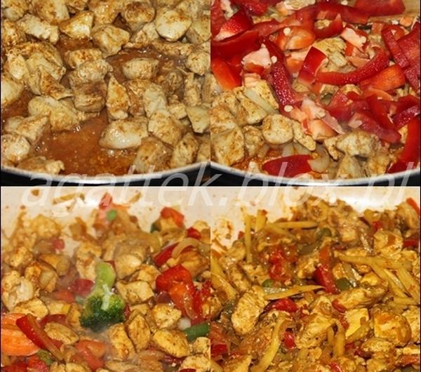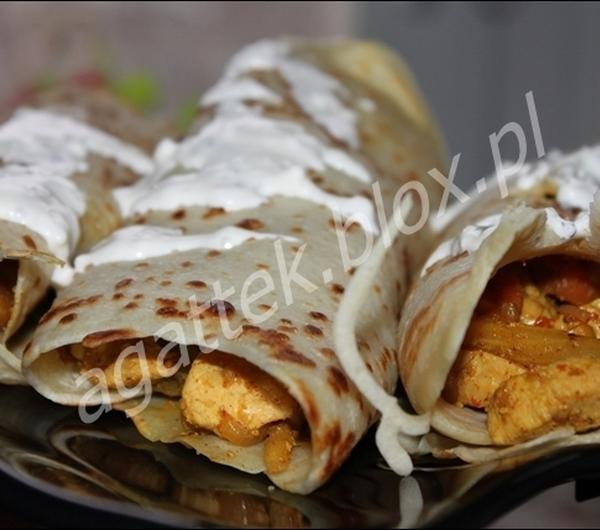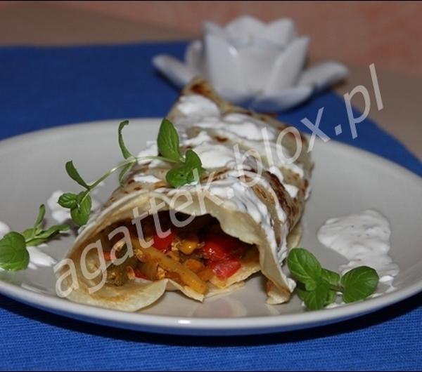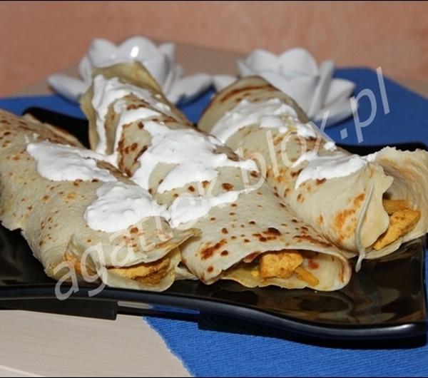 Wczoraj na obiad były naleśniki, ale rodzinka nie zjadła wszystkich i zostało mi parę (oczywiście pustych). Postanowiłam coś z nich wyczarować na dzisiejszy obiad. O to moja propozycja, mam nadzieję, że i Wam będzie smakować :-)Składniki:4 szt. naleśników2 filety z kurczaka2 cebule1/2 czerwonej paprykiok. 200 g mrożonych warzywok. 100 g pędów bambusa ze słoikaoliwa do smażeniaprzyprawa do kurczakaoreganokurkumaodrobina chillipieprz, sól na sos czosnkowy:3 ząbki czosnku2 łyżki majonezu1 łyżka gęstej śmietanyoreganoWykonanie:Filety umyć, osuszyć, pokroić w kostkę i obsmażyć na rozgrzanej oliwie. Następnie dodać pokrojoną paprykę i cebulę, mrożone warzywa i przyprawy. Wszystko razem dusić pod przykryciem. Pod koniec dodać pokrojone w cienkie paseczki pędy bambusa.W między czasie przygotować sos czosnkowy. Majonez wymieszać ze śmietaną, dodać czosnek przeciśnięty przez praskę i oregano.Każdy naleśnik wypełnić farszem z kurczaka, zawinąć i polać sosem czosnkowym. Naleśniki wcześniej podgrzać np. w mikrofali lub piekarniku.Smacznego :-)