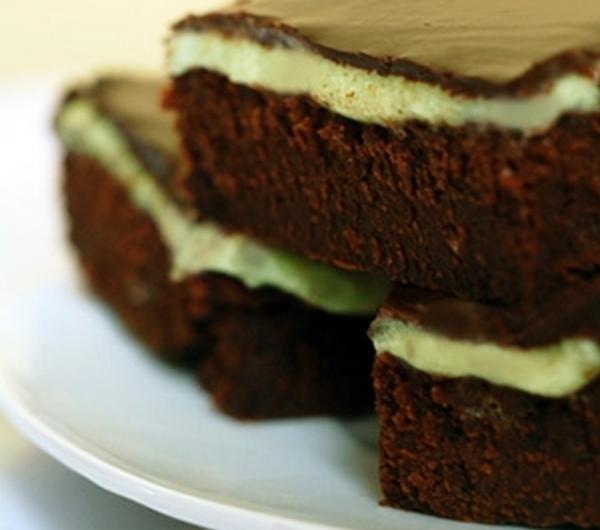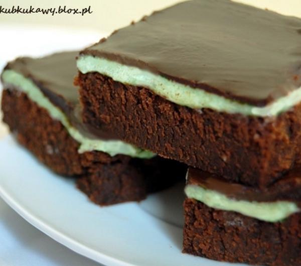Składniki (na blachę o wymiarach ok. 34,5x24,5 cm) - przepis po moich modyfikacjachCiasto226 g niesolonego masła pociętego na kawałki lub margaryny230 g gorzkiej czekolady grubo posiekanej340 g cukru kryształu (może być 300g)1,5 łyżeczki czystego waniliowego ekstraktu / aromatu4 jajka140 g mąki pszennej1/4 łyżeczki soliLukier miętowy4 łyżki (56 g ) niesolonego masła o temperaturze pokojowej2-3 łyżki gęstej śmietany230 g cukru pudr1 łyżeczka czystego ekstraktu miętowego lub kropli miętowych (z apteki)opcjonalnie – zielony barwnik spożywczyPolewa czekoladowa:170 g gorzkiej czekolady pokruszonej na kawałki2 łyżki (28 g) masła niesolonegoWykonaniePiec nagrzać na 160÷170̊C. Blachę wyłożyć papierem do pieczenia (powinien na tyle wystawać, żeby było nam wygodnie wyjąć później ciasto z blachy) i posmarować masłem.Ciasto – Miskę ze stali nierdzewnej umieścić na garnku z gotującą się wodą, rozpuścić w niej masło i czekoladę. Zdjąć z ognia i wymieszać z cukrem, olejkiem waniliowym. Dodawać po jednym jajku, części przesianej mąki i wymieszać dobrze trzepaczką lub drewnianą łyżką. Dodać sól. Ciasto ubijamy do momentu aż będzie gładkie, błyszczące i będzie odchodzić od miski (ok. 1 minuty, ciasto nie jest bardzo gęste). Przelać do blachy, piec w nagrzanym piekarniku ok. 25 minut lub do momentu rozpoczęcia odchodzenia ciasta od boków blachy. Gdy włożymy patyczek w środek ciasta powinno być prawie czyste. Wyjąć z pieca, zostawić do całkowitego ostygnięcia.Miętowy lukier – Masło i cukier włożyć do miski, miksować mikserem do dobrego połączenia. Masa powinna być gładka. Dodajemy do niej ekstrakt z mięty / krople miętowe, mieszamy. Najlepiej spróbować, czy moc miętowego smaku jest dla nas odpowiednia i dodać tyle kropli, by nam smakowało. Opcjonalnie można dodać zielony barwnik spożywczy, jeśli chcemy by miał miętowy kolor. Jeśli lukier jest zbyt gęsty to dodajemy śmietanę / jogurt, tak by masa była w sam raz do rozsmarowania. Lukier rozprowadzić na ostudzonym cieście i włożyć do lodówki na ok. 10 minut. (Lukru można zrobić z 3/4 porcji lub zniwelować trochę słodki smak dając mniej cukru, a więcej jogurtu lub masła)Czekoladowa polewa – Masło i czekoladę rozpuścić w kąpieli wodnej, tak jak na ciasto. Rozłożyć na ostudzonej miętowej masie i włożyć do lodówki na 30 minut lub do czasu stwardnienia czekolady.