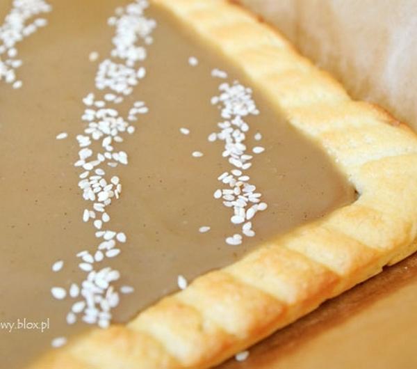 śmietanę i krótko wyrobić, aż składniki się połączą. Z ciasta zrobić kulkę, zawinąć w folię i schować do lodówki na minimum godzinę. Następnie wyłożyć ciasto na blachę (grubość ciasta ok 5 mm). Z pozostałości ciasta można zrobić ozdobne wałeczki wokoło blachy. Nakłuć ciasto i piec 15-20 minut w 200°C, aż się zarumieni. Ciasto nie rośnie, ma zostać płaskie. Przed nałożeniem masy ciasto schłodzić.Masa200 g