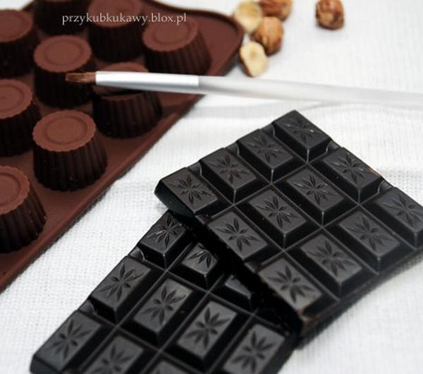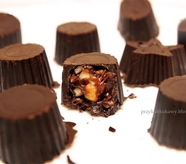 Orzechy obieramy ze skorupki, podgrzewamy przez 3 minuty w piekarniku nagrzanym do 190 stopni lub prażymy na suchej patelni. Obieramy, mniej więcej, z grubszych pozostałości skórki.Czekoladę deserową stapiamy w kąpieli wodnej (do garnuszka nalewamy na dno wody, doprowadzamy do wrzenia, na garnku ustawiamy miseczkę z połamaną czekoladę, zostawiamy do rozpuszczenia). Zostawiamy by przestygło do temp. pokojowej, ale nie było gęste.Pędzelkiem malujemy wewnątrz foremki. Dno powinno być nieco grubsze. Wstawiamy do lodówki na 5 minut. Po tym czasie malujemy drugą warstwę (w razie potrzeby rozgrzewamy nieco czekoladę) i wstawiamy na 5 minut do lodówki.Przygotowujemy nadzienie: rozgrzewamy do wrzenia śmietankę, zestawiamy z ognia, wrzucamy tam czekoladę, krem, i mieszamy aż do rozpuszczenia. Następnie dodajemy syrop (aromat) oraz posiekane na drobno orzechy. Mieszamy, zostawiamy aż osiągnie temp. pokojową.Do skorupek wkładamy łyżeczką nadzienie i równomiernie rozprowadzamy. Następnie łyżeczką nakładamy nieco pozostałej gorzkiej czekolady i rozprowadzamy równomiernie przykrywając ganache i robiąc dno czekoladki. Wkładamy do lodówki na godzinę, a gdy czekolada zastygnie wykładamy z foremki.
