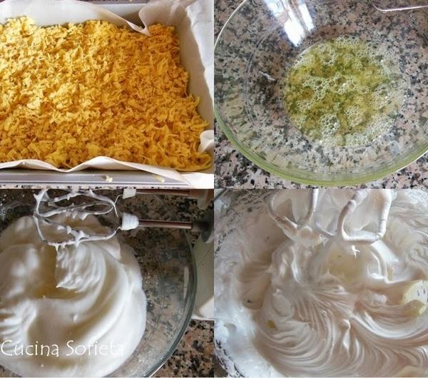 żółtka, szybko wyrabiamy. Ciasto owijamy folią spożywczą i wstawiamy do lodowki na 1 h( ja włożyłam do zamrażalnika). Formę wykładamy papierem do pieczenia. Zamrożone ciasto trzemy na tarce bezpośrednio na papier. Ciasto wstawiamy do piekarnika nagrzanego do 190 stopni i pieczemy 20 minut