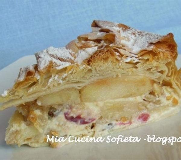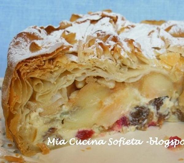Zapraszam na lekkie, zdrowe i pyszne ciasto z serkiem ricotta i jabłkami. W smaku przypomina strudel, z kremowym środkiem, pachnącym przyprawami, owocami kandyzowanymi, a wszystko otulone nieziemsko chrupkim ciastem filo. Efekt miły dla oka, a ciasto prościutkie i szybciutkie w wykonaniu.Przepis, choć nie gości u nas od dawna, jest sprawdzony. Wypatrzyłam i zapisałam go z włoskiego program kulinarnego “La prova del cuocco”, w którym “ziemscy” konkurenci gotują wraz z największymi szefami restauracji. Jak z szefami, to ciasto musi być pyszne. Polecam bardzo!!