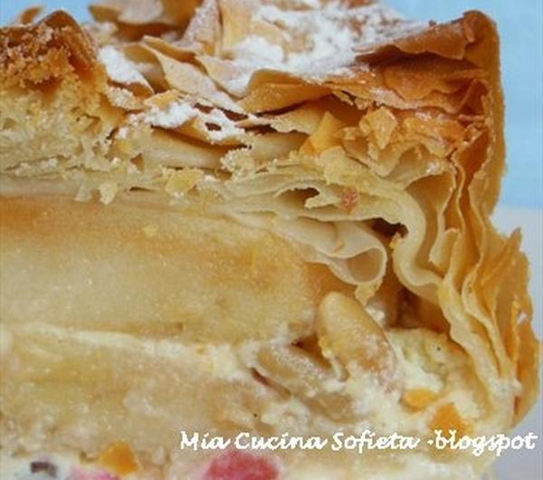 Składniki:250 g ciasta filo700 g jabłek( na szarlotkę)Skórka i sok z cytryny(biologicznej)50 g orzeszków pinii100 g rodzynek100 g owoców kandyzowanych2 łyżki kandyzowanej skórki pomarańczówej300 g serka ricotta1 jajko150 g masła/margaryny Kasia1 kieliszek rumu60 g cukru½ łyżeczki cynamonuZiarenka z ½ laski waniliiCukier puderObieramy jabłka, kroimy na ósemki, usuwamy gniazda, posypujemy je cynamonem i spryskujemy sokiem z cytryny, aby nie pociemniały. Orzeszki pinii prażymy na teflonowej patelni. Rodzynki wraz ze skórką z cytryny i ziarenkami wanilii zalewamy rumem.Na patelni rozpuszczamy 20 g masła, dodajemy jabłka i smażymy przez dwie minuty, na średnim ogniu.Dodajemy cukier i bardzo delikatnie mieszamy. Jabłka smażymy parę minut, pamiętając, że jabłka nie mogą się rozgotować. Od czasu do czasu potrząsamy patelnią, aby zamieszać jej zawartość.W osobnej miseczce mieszamy serek ricotta z jajkiem( byle jak), dodajemy owoce kandyzowane, rodzynki i orzeszki pinii. W mikrofali rozpuszczamy masło.Teflonową tortownicę (cm 22, z otwieraną obręczą) smarujemy margaryną. Dno i boki tortownicy wykładamy płatami ciasta filo. Jeden płat, i smarujemy go obficie masłem, po przekątnej drugi i znów traktujemy go masłem. Postępujemy tak, aż spód ciasta będzie miał piec warstw ciasta filo. Na tak przygotowany spód, nakładamy ½ masy serowej, a następnie połowę jabłek, przykrywamy masą serową i kończymy jabłuszkami. Tylko ostrożnie, bo jabłuszka mogą się rozlecieć. Całość przykrywamy wystającymi końcami ciasta filo, pamiętamy o smarowaniu masłem. Ostatnie dwa płaty smarujemy masłem na blacie i marszczymy, tak umarszczone kładziemy na wierzchu ciasta. Z ciastem filo trzeba szybko pracować, max 10 min, ponieważ ma tendencję do wysychania i łamania się.Tak przygotowane ciasto wkładamy do nagrzanego do 190°-200°C piekarnika na 30 minut. Po tym czasie, zdejmujemy obręcz i pieczemy jeszcze przez 10 minut, tak aby brzegi ładnie się zarumieniły. Przed podaniem posypujemy cukrem pudrem.
