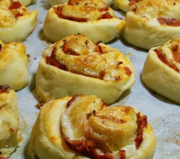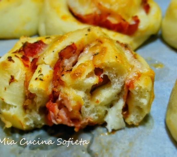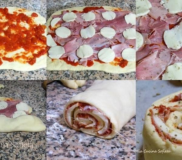 ziołami. Zwijamy w roladę. Przy pomocy nici dentystycznej tniemy roladę na krążki, które układamy na blasze i pozostawiamy przez 30 min do napuszenia. Analogicznie post ęujemy z drugim