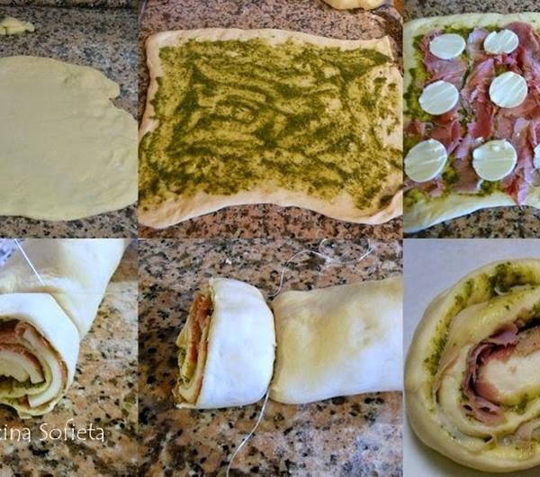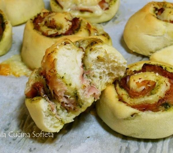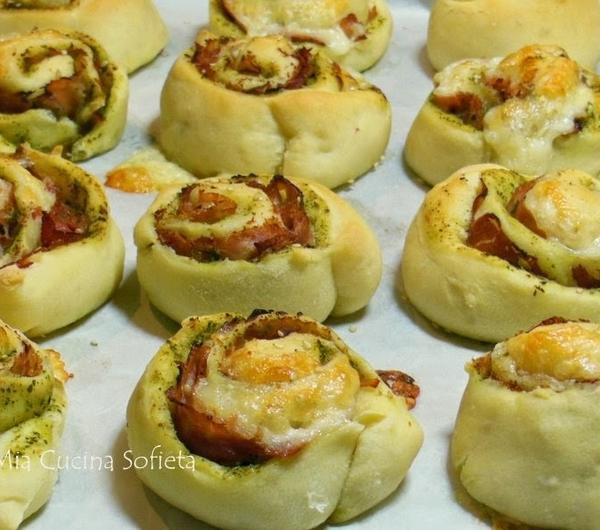 Potem wystarczy tylko równomiernie rozłożyć nadzienie na cieście, zwinąć w roladę i przy pomocy nici dentystycznej wycinać idealne krążki.Ślimaczki wyszły pulchne, miękkie i bardzo aromatyczne. Nawet mój sceptyczny mąż przekonał się, że pesto nadaje się nie tylko do