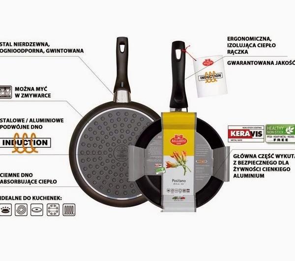 czemu potrawy są zdrowsze i mniej kaloryczne. Te same rowki nadają potrawie wygląd dania z grilla. Tylko nie popełnijcie mojego błędu. Byłam tak zaaferowana tym, że do patelni nic nie przywiera, że od razu uniosłam ją nad palnik i sprawdzałam czy hamburgery wirują po powierzchni. Wierzcei mi na słowo, wirują))Oprócz tego patelnia posiada trójwarstwową powłokę Keravis non -stick, odporną na ścieranie i uszkodzenia mechaniczne. Nareszcie patelnia, której nie straszne są noże i widelce! Dzięki powłoce Keravis, potrawy nie przywierają, smażymy bez tluszczu. A jak nic nie przywiera, to nie ma co skrobać przy myciu! Myjka i płyn wystarczą. Koniec z namaczaniem i szorowaniem!Patelnia o wymiarach 28cm x 28 cm, jest na tyle duża, że swobodnie można na niej przygotować obiad dla 4 osób. Niewątpliwą jej zaletą jest również nienagrzewająca się i ergonomiczna rączka.Po więcej technicznych szczegółów zapraszam na stronę Ballarini.plPozwolę sobie tylko podzielić się z Wam schematem, który