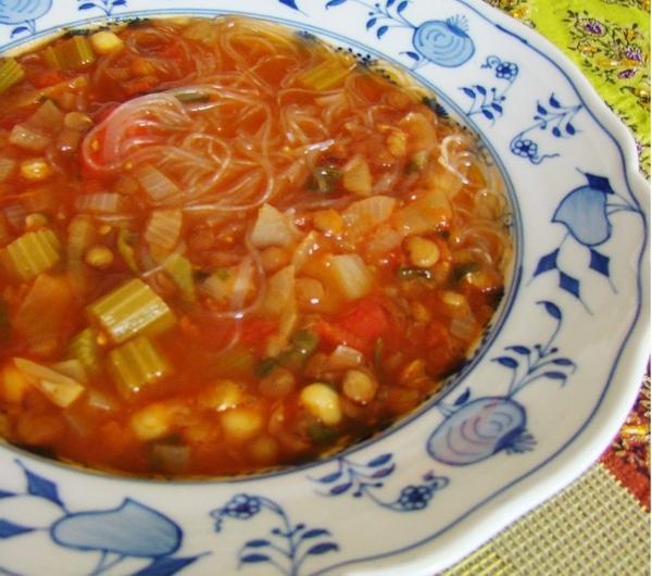 Harira to charakterystyczna marokańska zupa, mam nadzieję, że niedługo spróbuję jej sama :). Bardzo rozgrzewa, dzięki przyprawom i roślinom strączkowym i syci. Któregoś dnia zobaczyłam w zwykłym sklepie takie cudo, jak makaron vermicelli. Nie wiedziałam co z niego zrobić, ale kupiłam z ciekawości. Postanowiłam zrobić harirę i wtedy znalazłam ten makaron w szufladzie, sprawdziłam i okazało się, że harirę można podawać właśnie z tym makaronem :D. Vermicelli jest sojowy albo ryżowy i ma bardzo cienkie nitki. Można zastąpić zwykłym makaronem ryżowym, ryżem albo podawać bez niczego. Mimo, że zimy nie ma, zawsze warto zjeść miskę ciepłej i zdrowej zupy :).Składniki ( 6 porcji):- 2 cebule- 2 łodygi selera naciowego- 3 łyżki oleju rzepakowego/ masła- 1 łyżka posiekanej kolendry- 1/2 łyżeczki imbiru- 2 łyżki posiekanej natki pietruszki- 1 szklanka przecieru pomidorowego- 1 puszka pomidorów/ 3 świeże pomidory- 2 l wody- 1 łyżka przyprawy marokańskiej*- 1 łyżeczka słodkiej papryki, 1/2 łyżeczki ostrej papryki- 1/2 szklanki zielonej soczewicy- 1 szklanka ugotowanej ciecierzycy/z puszki- makaron vermicelli / ryż do podania- 1/2 łyżeczki soli, pieprz do smaku, szczypta cukruCebule pokrój w kostkę, a seler naciowy w plasterki. Soczewicę przepłucz. Na rozgrzany olej wrzuć cebulę i seler, gdy się zeszkli zalej zalej przecierem, pokrojonymi w kostkę pomidorami,wodą. Dodaj przyprawy, soczewicę, dokładnie wymieszaj. Gotuj ok. 45 minut. Po tym czasie dodaj ciecierzycę, gotuj jeszcze 10 minut. Jeśli chcesz zjeść zupę z makaronem vermicelli czy ryżem, dodaj go razem z ciecierzycą i gotuj tyle ile jest napisane na opakowaniu.* Przyprawę można kupić albo zrobić samemu. Polecam kupić, bo można ją dodawać do wielu potraw, ostatnio stała się moją ulubioną przyprawą. Jeśli chcecie ją zrobić samemu, odsyłam do bloga Filozofia smaku .