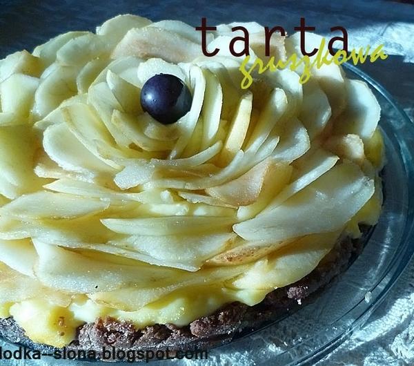 Pycha, pycha, pycha! Tarta gruszkowa na spodzie pachnącym kakao, z waniliowym budyniem, polana miodem i pokruszona odrobiną cukru trzcinowego. Tarta rozpływa się w ustach!Składniki na spód:2 szklanki mąki4 żółtkapół margaryny kasi2 łyżki kakao2 łyżki cukru+ budyń waniliowy na 0,75l mleka+ 2 szklanki mleka+ około łyżeczki cukru trzcionwego+ 2 łyżki miodu+ 7 gruszek+ bułka tarta do wysypania tortownicyZaczynamy od wyrabiania ciasta - wszystkie składniki dobrze ze sobą mieszamy, aż uzyskamy jednolitą masę, jeśli jest za dużo mąki to dodajemy masła. Następnie smarujemy tortownicę masłem i posypujemy bułką tartą. Następnie wykładamy ciasto na tortownicę i nakłuwamy widelcem. Wkładamy do piekarnika na około 15 minut na 180C (ale kontrolujemy być może wystarczy 10 minut). W międzyczasie myjemy gruszki, obieramy i kroimy w plastry. W garnku gotujemy jedną szklankę mleka, w drugiej mieszamy budyń. Gdy mleko się zagotuje dodajemy szklankę z budyniem i mieszamy do zgęstnienia. W tym momencie powinno być ciasto gotowe, więc wykładamy na nie budyń i układamy plastry gruszek. Na końcu polewamy miodem i posypujemy cukrem - uwaga gruszki puszczają dużo soku, więc tortownica może ciec, więc warto położyć ją na blachę, jeśli nie chcecie mieć pary buchającej przy otwarciu piekarnika ;-) Pieczemy jeszcze około 10-15 minutek na 180C!Smacznego!O.