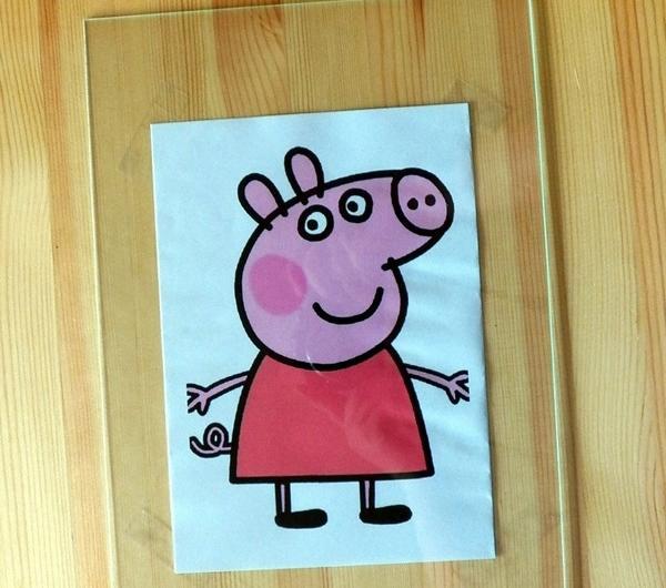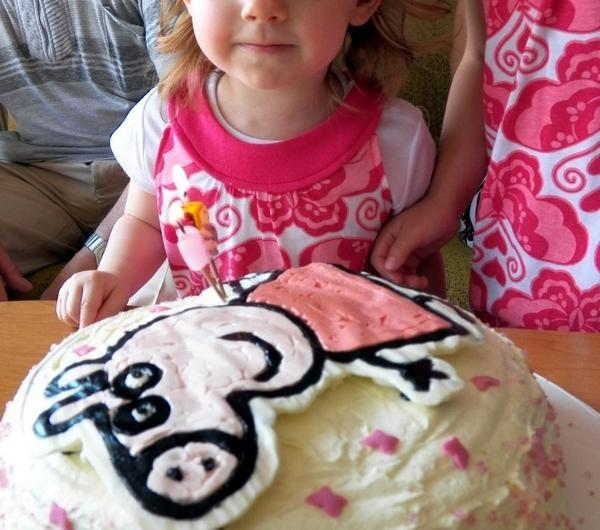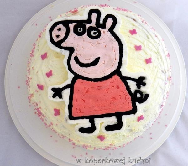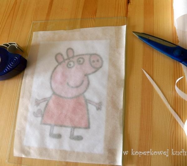 cukrem błyszczącym.Świnkę Peppę wyjmujemy z zamrażalnika i razem z papierem do pieczenia zdejmujemy ze szkła. Ostrożnie przekładamy na tort (papierem do pieczenia do góry) i bardzo ostrożnie odklejamy papier do pieczenia.Tort ozdabiamy jeszcze cukrowymi motylkami i podajemy.