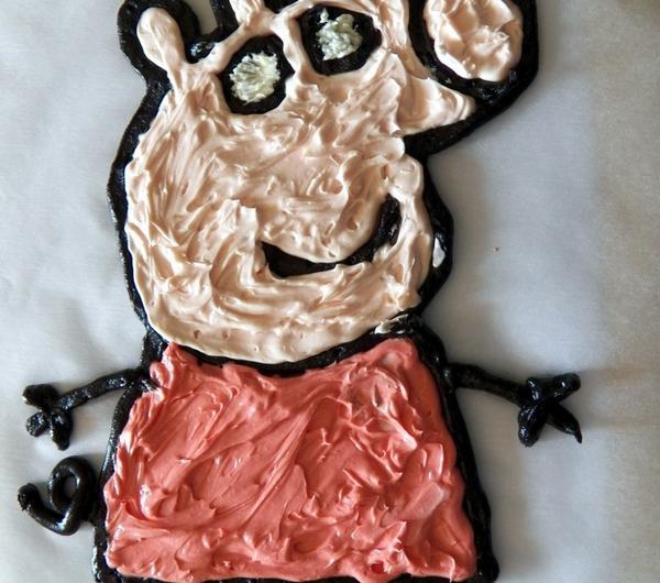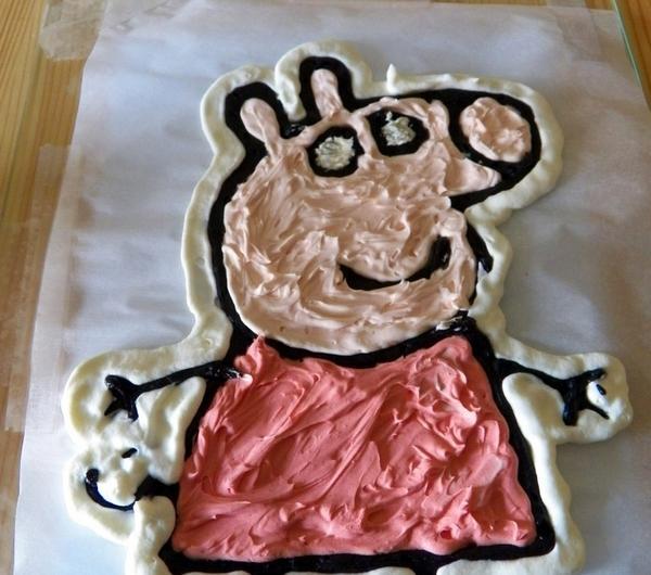 maślanego, różowego kremu dokładamy troszkę więcej czerwonego barwnika i powstałą masą wypełniamy sukienkę Peppy (też za pomocą szprycy).Teraz całość wyrównujemy, uważając, żeby nie zostawić żadnej szczeliny.Możemy odczepić przyklejony wydruk i podejrzeć przez szkło, czy na pewno wszystko jest dokładnie wypełnione i czy kolory się nie pomieszały. Odstawiamy do zamrażalnika.