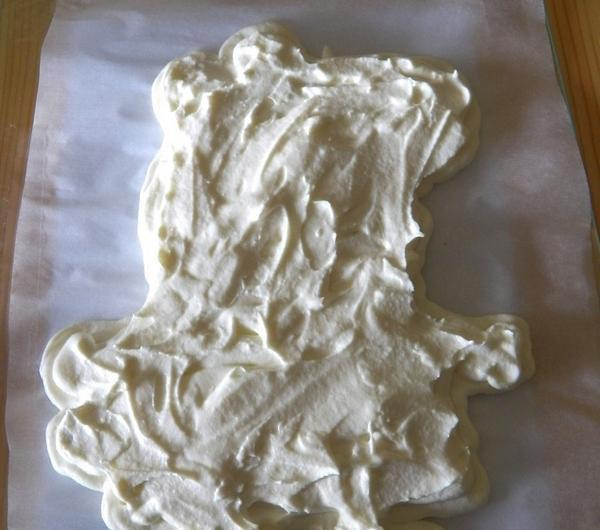 Cały obrazek pokrywamy w miarę cienką warstwą kremu i ostrożnie wyrównujemy. Odstawiamy do zamrażalnika, najlepiej na kilka godzin- obrazek musi całkowicie zamarznąć.W tym czasie ubijamy mikserem