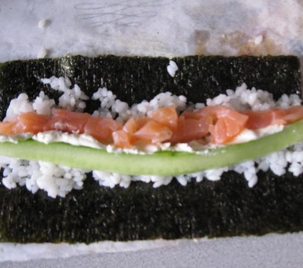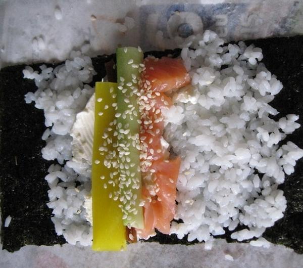 ryżu (jak nałożymy za dużo to się pozostałe składniki nie zmieszczą, jak za mało to się później nie zlepi - każdy po kilku próbach sam będzie wiedział ile tego