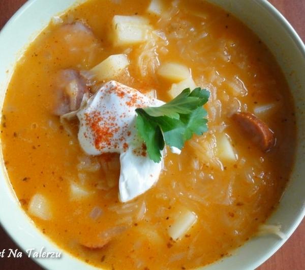 papryka stanie się gorzka). Na patelnię wlać chochelkę naszej gotującej się zupy i dobrze wymieszać, po czym przelać zawartość patelni do garnka zupą. Dodać pokrojoną w plasterki