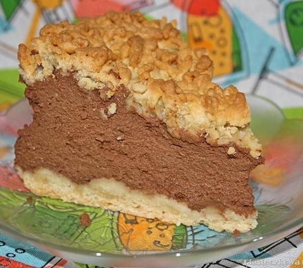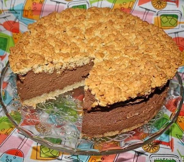 Składniki na ciasto (na tortownicę 26 cm ):1 kostka margaryny Kasia3,5 szklanki mąki pszennej2 żółtka3 łyżki cukru pudru3 łyżki cukru z dodatkiem wanilii3 łyżki śmietany 18%2 łyżeczki proszku do pieczeniaSkładniki na masę serową:1 kg sera z wiaderka4 żółtka4 białka1 szklanka cukru pudru300 g gorzkiej czekoladyMąkę, dwa żółtka, margarynę ( posiekaną na kawałki),3 łyżki cukru pudru, żółtka,cukier z wanilią, śmietanę, proszek do pieczenia zagniatamy na gładką masę, dzielimy na dwie równe części, zawijamy w folię spożywczą i wkładamy do zamrażalnika. Czekoladę rozpuszczamy w kąpieli wodnej, czekamy aż przestygnie. Ser miksujemy na gładką masę dodajemy szklankę cukru pudru, czekoladę. Ubijamy białka ( ubiłam na sztywno, można ubić lekko) i na koniec dodajemy je do masy serowej delikatnie mieszając. Wyjmujemy z zamrażalnika jedna część ciasta, ścieramy ją na tarce na dno tortownicy, wysmarowanej masłem i oprószonej lekko mąką. Dociskamy do dna, aby nie było dziurek i masa nie przelała się na dno. Przelewamy masę serową, równamy ją, następnie na wierzch ścieramy drugą część ciasta, tak aby nie została wolna przestrzeń. Pieczemy w temperaturze 180 st. C przez pierwsze około 20 minut, a następnie zmniejszamy temp do 160 st. C ( można wyczuć kiedy zmniejszyć temp, jak zarumieni się lekko kruszonka). Smacznego!!!