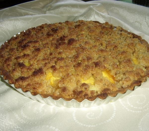 brzoskwinie, posypujemy kruszonką i wstawiamy do piekarnika jeszcze na pł godziny (kruszonka ma być złota, w razie czeko włączamy grzałkę tylko na górę, zeby spód tarty się nie przypalił.