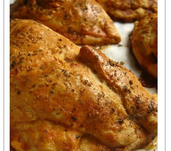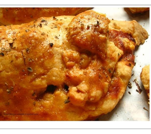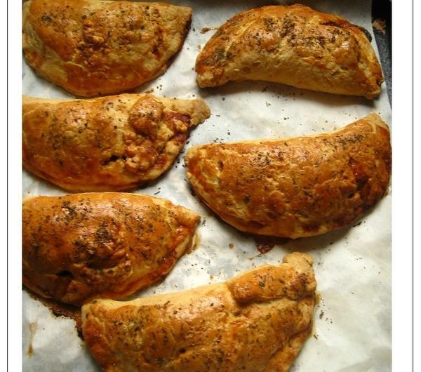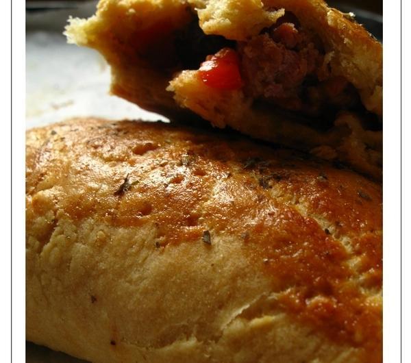 Te meksykańskie pierożki zobaczyłam na blogu Dwie Chochelki . Zachwyciłam się nimi. O dziwo nie zniechęciło mnie nawet ciasto krucho-drożdżowe. Z duszą na ramieniu, i w wielkim pośpiechu, zaczęłam je tworzyć w niedzielę, podczas (na szczęście 2h) drzemki Mojego Maluszka. Strasznie chciałam, żeby mi się udały, gdyż miałam zawieźć je Mężusiowi na dyżur. No i z tego pośpiechu chyba, odczarowałam wreszcie ciasto kruche, które jak zaklęte nigdy mi się nie udawało. Wyszły pyszne. W oryginale meksykańskim, za książką Judith Ferguson "Kuchnie świata", są one na wołowinie i z ciastem drożdżowym. U Chudej występują w spolszczonej wersji - z wieprzowiną, w tym cudownym ciachu:) Ja poszłam krok dalej, gdyż są dodatkowo chudziutkie i niezbyt ostre. U mnie w lodówce gościło jedynie mięso mielone z indyka, więc takowe dołożyłam. Zaznaczam jedynie, że farszu wychodzi zdecydowanie więcej, niż ciasta. Można robić je malutkie, jako przekąskę, lub większe, jako danie obiadowe. Ja przyjęłam wersję drugą i lepiłam od talerzyka deserowego - wyszło 6 pokaźnych pierożków.