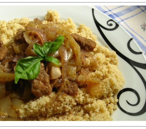 Składniki na 2-3 osoby:dwa kotlety ze schabujedna żółta lub biała paprykaświeży imbir - około 10 cmimbir w proszkujedna czerwona cebulapieprz świeżo mielonysólolej sezamowymąka ziemniaczana 1łyżeczkawodaKotlety zbić, posolić i obficie popieprzyć. Pokroić na wąskie paski, zalać olejem sezamowym i sosem sojowym, zostawić na 15 minut. Na suchej patelni teflonowej podsmażyć około 4-5 minut paprykę pokrojoną w paski. Wrzuć na nią mięso wraz z olejem i sosem, smażyć razem z cebulą pokrojoną w piórka około 6 minut. Imbir obrać i zetrzeć na tarce na dużych oczkach. Dodać do dania - smażyć jeszcze 2 minuty. Całość jeszcze raz popieprzyć i posolić, dodać ewentualnie pół łyżeczki imbiru w proszku, zalać odrobiną wody, zmniejszyć ogień, przykryć i dusić około 5 minut. W małym kubeczku do ekspresso rozpuścić 1 łyżeczkę mąki ziemniaczanej w ZIMNEJ wodzie. Podlać danie cały czas je mieszając, żeby równomiernie zgęstniało - doprowadzić do wrzenia. Wyłączyć. Podawać z kaszką kus kus. Smaczności !