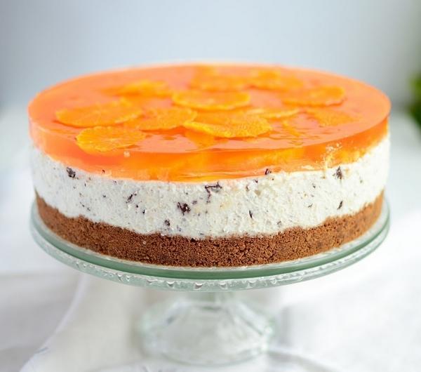 Herbatniki pokruszyć w robocie lub ręcznie, dodać stopione masło i dokładnie połączyć składniki. Herbatnikami wylepić dno tortownicy (23cm), dokładnie dociskając. Wstawić do lodówki do schłodzenia.Żelatynę rozpuścić w 1/4 szklanki gorącej wody, przestudzić. Ser przełożyć do miski, dodać cukier puder i ekstrakt z wanilii. Zmiksować do połączenia się składników. Dodać stopioną, przestudzoną białą czekoladę oraz mleko kokosowe. Zmiksować. Cienką strużką wlewać przestudzoną żelatynę cały czas miksując. Do masy serowej dodać posiekaną gorzką czekoladę i dokładnie wymieszać łyżką. Masę serową przełożyć na spód z herbatników. Dokładnie wyrównać wierzch. Wstawić do lodówki do stężenia.Galaretkę rozpuścić w 400 ml gorącej wody, wystudzić i pozostawić do lekkiego stężenia. Mandarynki obrać i pokroić na plasterki ułożyć na wierzchu sernika. Owoce zalać tężejącą galaretką. Wstawić do lodówki do całkowitego stężenia. Smacznego!