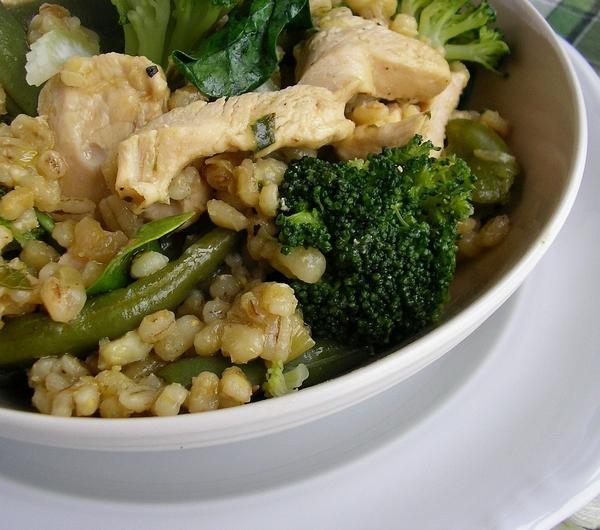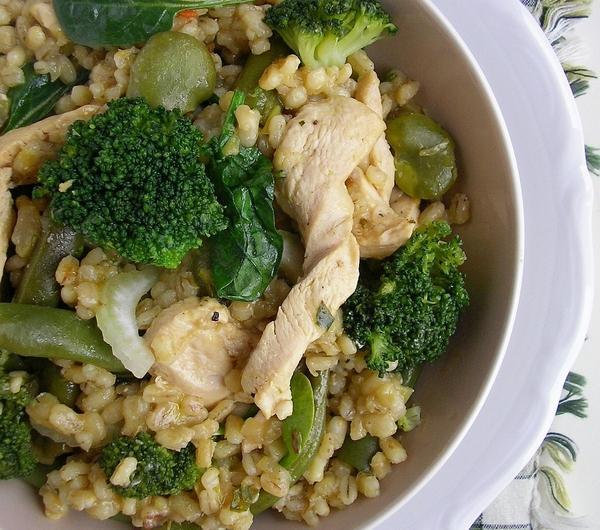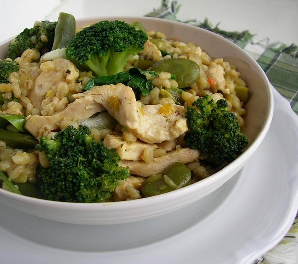 Na patelni rozgrzać masło z dodatkiem oleju. Wrzucić pokrojonego drobno pora oraz posiekaną w kostkę cebulę. Smażyć chwilę. Dodać przeciśnięty przez praskę czosnek. Wsypać kaszę i wymieszać. Smażyć do czasy, aż kasza zrobi się szklista. Wlać chochelkę bulionu i dusić do czasu, aż kasza wchłonie cały płyn. Podlewać stopniowo bulionu. Brokuła podzielić na różyczki. Fasolkę pociąć na mniejsze kawałki. Warzywa razem z bobem ugotować na półtwardo w parowarze lub na parze. Bób obrać ze skórki. Pierś z kurczaka pokroić na paski. Kiedy kasza wchłonie 3/4 bulionu, wrzucić pierś z kurczaka oraz pokrojony seler naciowy. Dusić do miękkości. Podlać pozostałym bulionem i dodać ugotowane warzywa oraz świeży szpinak. Całość dusić jeszcze około 5 minut. Posypać posiekanym lubczykiem i świeżo zmielonym pieprzem. Podawać gorące.