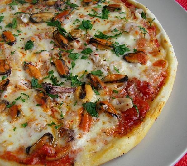 Składniki:400 g mąki pszennej220 ml ciepłej (nie gorącej) wody20 g świeżych drożdży1 łyżeczka cukru1 łyżeczka soli2 łyżki oliwy z oliwekSos:2 średnie, mięsiste pomidory (najlepiej san marzano)2 łyżki koncentratu pomidorowego1/2 łyżeczki cukru2 łyżeczki suszonego oregano1 duży ząbek czosnku1 łyżka oliwy z oliwek1/4 łyżeczki chiliDodatki:500 g mieszanki owoców morza (małże, kalmary, ośmiorniczki, krewetki)250 g sera mozzarella (w kulach)100 g startego sera mozzarella1 średnia cebula1 / 2 łyżeczki chili w płatkach lub 1 mała ostra papryczka