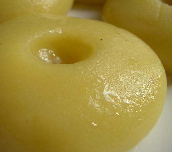oleju. Z masy ziemniaczanej formujemy kulki wielkości piłki golfowej, lekko je spłaszczamy i robimy na środku charakterystyczną dziurkę. Kluski wrzucamy na gotującą