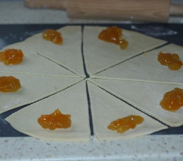 margarynę.Zagniatamy ciasto i zostawiamy do w rozsunięcia na 1 godzinkę.Ciasto dzielimy na cztery części , wałkujemy kolo i kroimy na osiem trójkątów.Na każdy trójkąt kładziemy