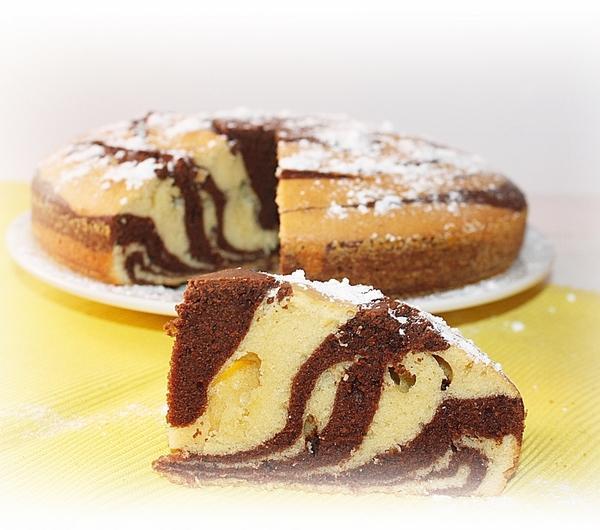 bułką tartą .Wlewałam ciasto na przemian białe i czarne, aż do końca.Piekłam 55 minut w 170 stopniachPo ostudzeniu posypałam