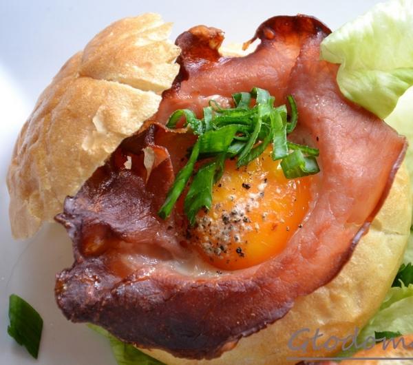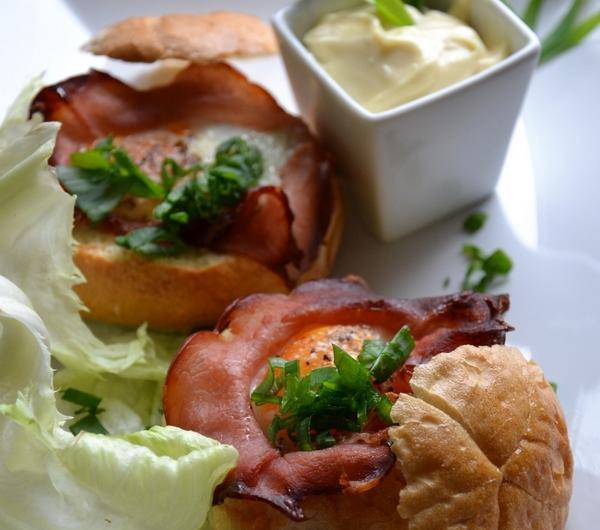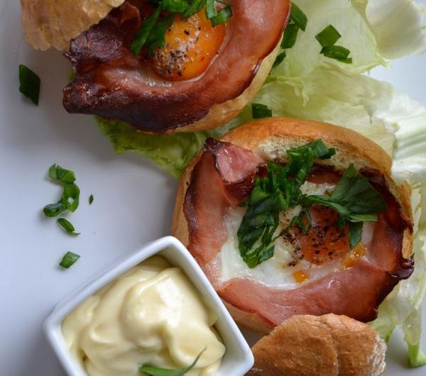 Przygotowanie:Z czerstwych bułek odcinamy górną część. Z dolnej części wydrążamy miąższ tak by powstała a la miseczka. Wnętrze bułki smarujemy masłem. Wkładamy do środka plaster szynki lub boczku dobrze go dopasowując by zachować formę miseczki. Do środka wbijamy po jajku. Może się zdażyć, że jajko będzie za duże i białko zacznie wypływać dlatego możemy odlać odrobinę białka z każdego jajka zanim włożymy je do miseczek i wykożystać np. do pysznego deseru o którym napiszę niebawem. Solimy i pieprzymy. Wycinamy z papieru do pieczenia cztery kawałki nieco większe od bułek. Smarujemy je lekko oliwą lub masłem. Bułki układamy na papierze i wkładamy do piekarnika nagrzanego do 150 stopni i pieczemy do czasu aż żółtko się zetnie (ok. 20-30 min ). Pod koniec pieczenia dokładamy do piekanarnika nasze „daszki” odcięte na początku przygotowań, by chwilkę się podpiekły.Gdy białko się już zetnie wyjmujemy kanapeczki z piekarnika, posypujemy drobno posiekanym szczypiorkiem i podajemy.