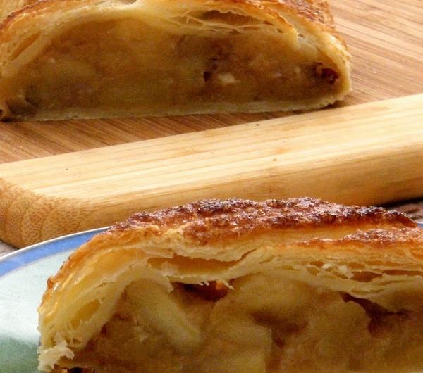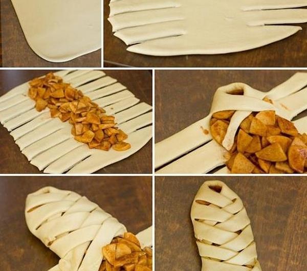 ciasta francuskiego, boki ciasta naciąć w kilka-kilkanaście pasków i następnie sklejać przekładając paski przez farsz.