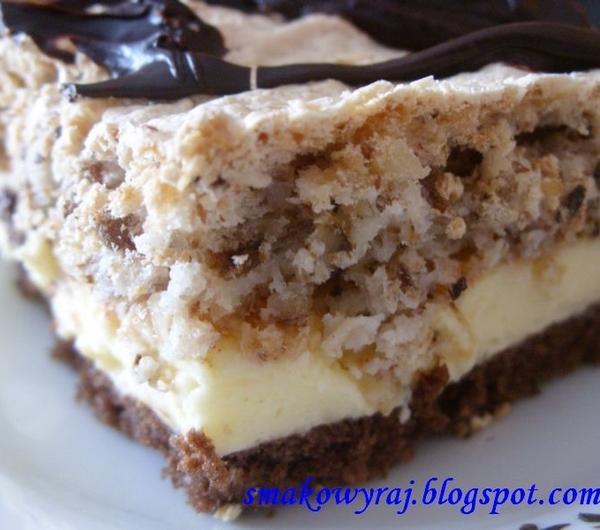 Wszystko jeszcze raz mieszamy i wylewamy na dużą blaszkę wyłożoną pergaminem. Ciasto pieczemy nagrzanym piekarniku, w temperaturze 170°C około 35minut. Po upieczeniu pozostawiamy na około 10 minut w piekarniku.Masa budyniowa:1litr mleka3 budynie waniliowe¾ szklanki cukrużółtka (pozostałe z masy bezowej)200g masła (82%)Część mleka odlewamy do średniej wielkości słoiczka, do którego następnie dodajemy żółtka i wsypujemy budynie. Zakręcamy słoik i potrząsamy nim kilka razy, by zawartość się dobrze zmieszała. Resztę mleka zagotowujemy, gdy zacznie się podnosić dodajemy do niej cukier i mieszamy przez chwilę by się rozpuścił, następnie wlewamy zawartość słoiczka i cały czas mieszamy, do chwili gdy budyń zgęstnieje. Gotowy budyń pozostawiamy do całkowitego ostygnięcia częściowo przykryty. Jeśli gotujemy w garnku z grubym dnem, najlepiej budyń przełożyć do innego naczynia, by budyń szybciej przestygł.Biszkopt kakaowy:4 jajka1 szklanka cukru1 szklanka mąki1 łyżeczka proszku do pieczenia1 łyżka kakaoBiałka oddzielamy od żółtek. Białka ubijamy na sztywną pianę, po czym dodajemy do nich cukier, stale ubijając dodajemy po jednym żółtku, bijemy jeszcze około 3 – 5 minut, po czym dodajemy po trochu przesianą mąkę, zmieszaną z proszkiem i kakao i mieszamy łyżka. Gotową masę przekładamy do blaszki (tej samej wielkości, w której piekliśmy masę bezową) wyłożonej pergaminem i pieczemy około 20 minut w temperaturze 180°C.Wystudzony biszkopt delikatnie odrywamy od papieru, to samo robimy z wystudzoną masą bezową, (przy czym uwaga, by się nie złamała).Miękkie masło ucieramy mikserem, po czym dodajemy do niego po trochu zimny budyń i cały czas ucieramy. Gotową masę budyniową przekładamy na biszkopt, po czym przykrywamy go masą bezową i robimy polewę.Polewa:70g czekolady100ml śmietanki kremówki (30%)Śmietankę zagotowujemy w garnuszku, po czym dodajemy do niej pociętą na drobniejsze kawałki czekoladę i cały czas mieszamy, do chwili, gdy powstanie jednolita masa czekoladowa.Gorącą czekoladą oblewamy wierzch ciasta i pozostawiamy go, na co najmniej 2 godziny by ciasto wystygło, a jeszcze lepiej przystąpić do konsumpcji następnego dnia ;)