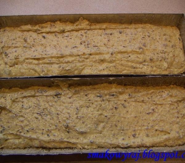 Gotową masę ciastową przekładamy do wysmarowanej margaryną i wysypanej bułką tartą foremki. Ja piekłam w dwóch blaszkach 30cm długich x 10cm szerokich x 6 cm wysokich. Wyszły idealne.