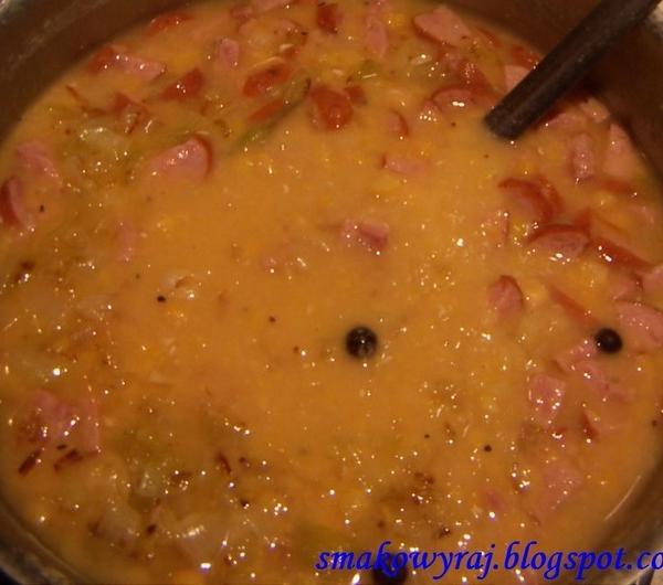 Następnie zalewamy około 1,5 litra zimnej wody i pozostawiamy na kilka godzin do napęcznienia (jeśli brakuje nam na to czasu to od razu po przelaniu gotujemy). Przed gotowaniem wylewamy zimną wodę i zastępujemy ją gorącą, dzięki czemu zupa szybciej się zagotuje. Dodajemy sól, listki laurowe i ziele angielskie. Po zawrzeniu zupę gotujemy na wolnym ogniu, pod przykryciem, około 40 minut, co pewien czas mieszając. Kiełbasę kroimy w kosteczki i wrzucamy do zupy, gdy groch jest już prawie gotowy. Na koniec gotowania dodajemy podpieczoną na margarynie cebulkę i robimy zasmażkę. Margarynę rozpuszczamy na patelni lub w rondlu, w którym wcześniej podpiekaliśmy cebulkę. Do rozpuszczonej margaryny dodajemy mąkę i mieszamy trzepaczka. Dolewamy po trochu chochlą płynnej zupy i mieszamy. Gdy powstanie nam gęsta zawiesina przypominająca sos, dodajemy ją do zupy.
