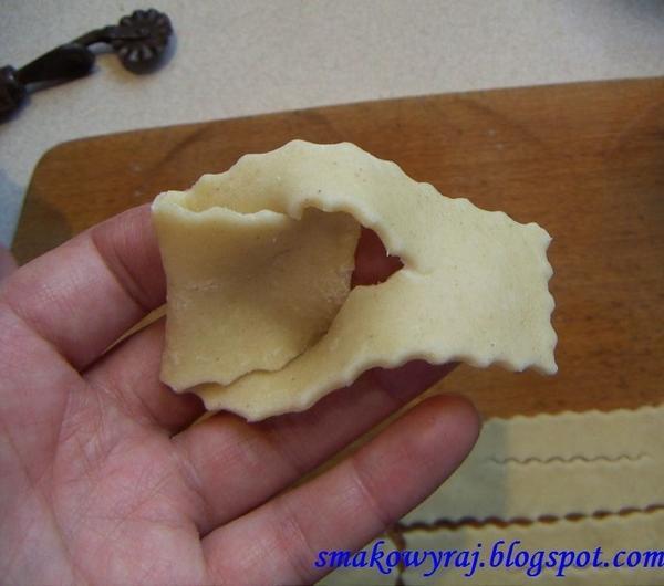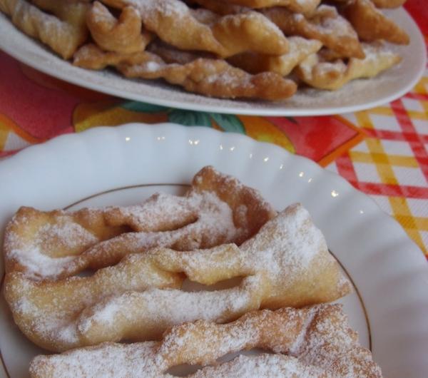 Chrust:30g margaryny½ szklanki wody2 łyżki cukru2 jajka½ łyżeczki proszku do pieczenia½ kg mąki (+ około szklanki do podsypania)+ ewentualnie 1 łyżka alkoholu (spirytusu, wódki, koniaku)Dodatkowo:ok. 1kg smalcu lub oleju do smażeniaok. 1 szklanka cukru pudruWodę zagotowujemy z margaryną i cukrem, pozostawiamy do ostygnięcia. Do miski wsypujemy około pół kilograma mąki, wlewamy ostudzoną mieszaninę, dodajemy proszek do pieczenia i jajka. Całość wyrabiamy pierw widelcem, a następnie rękoma. Wyrabianie chrustu podobne jest do makaronu. Wyrobione ciasto dzielimy na 3 lub 4 części, każdą wałkujemy na grubość około 2 - 3mm i kroimy radełkiem lub nożem w prostokąty.
