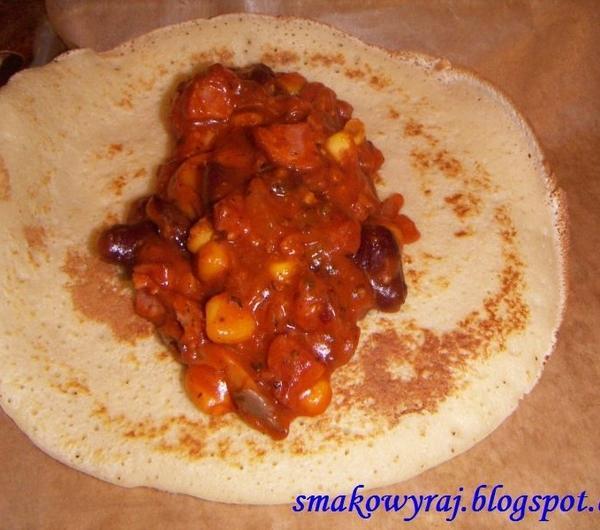 Pewnie zaskoczyła Was nazwa mojego dania :) Truposz w dywanie to pierwsze skojarzenie jakie mi się nasunęło po zrobieniu po raz pierwszy naleśników z kiełbaskowym farszem. Są ciekawą propozycja na ciepłą kolację lub obiad, a farsz można jeść również bez naleśnika. Polecam serdecznie :)Farsz:4 kawałki kiełbasy śląskiej (lub więcej :)1 duża cebula1 puszka czerwonej fasolki1 puszka kukurydzy1 puszka pieczarek4 łyżki przecieru pomidorowego (lub puszkę pomidorów)1 łyżeczka pieprzu Cayenne1 łyżeczka ziół prowansalskich½ łyżeczki bazylii½ łyżeczki kolendry½ łyżeczki gyrosu½ łyżeczki soli2 łyżki mąki do zagęszczenia30g margarynyNaleśniki:3 jajka3 szklanki mleka2 ¼ szklanki mąkiDodatkowo:Ok. 200gr żółtego sera, może być goudaKiełbasę i cebulę obieramy ze skórki, kroimy w kosteczki i podpiekamy na patelni, z dodatkiem margaryny.